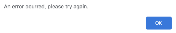 When testing a campaign email, you may receive a popup notification with an error message that states "An error occurred, please try again." The message will look like this: