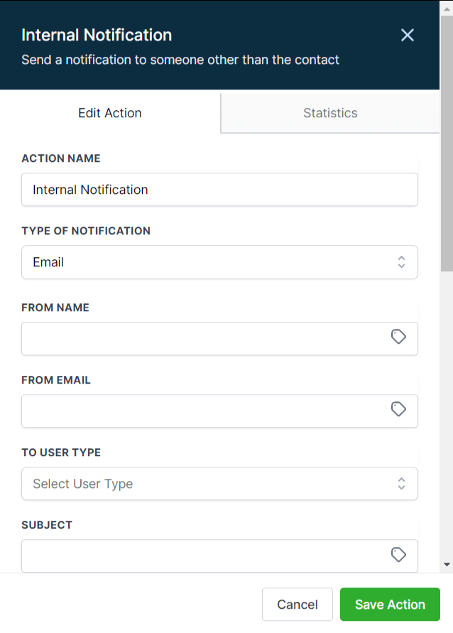 * Under Actions, select “Send Internal Notification” in the “CRM” section of the Actions Menu